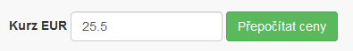 Zadáním kurzu a potvrzením tlačítka se přepočítají všechny ceny EUR u každého produktu, kde se pro výpočet bere cena v Kč.
