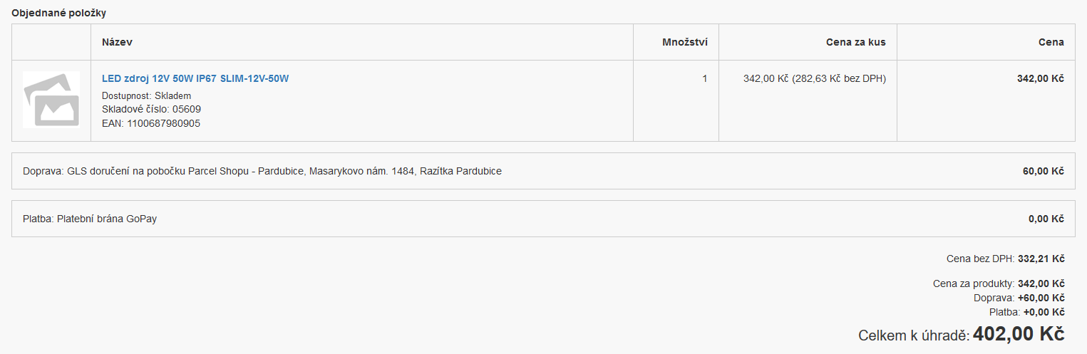 Seznam všech objednaných produktů, vybrané dopravy a platební metody. Na konci těchto položek je součet za celou objednávku.