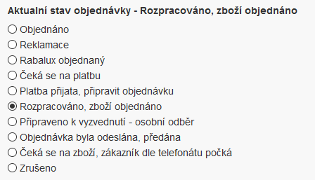Jesliže je objednávka vytvořena, tak má výchozí stav "Objednáno". Jedná se o systémový stav, který je pevně nastavený. Další stavy se dají vytvářet v sekci stavy objednávky.
