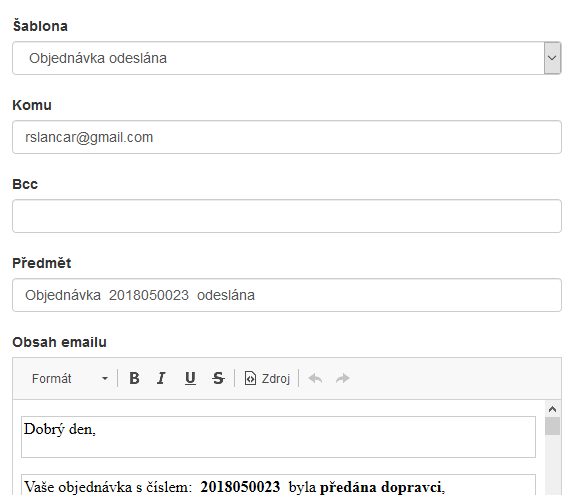 Emailová komunikace slouží pro odeslání emailu a informovat tak zákazníka o změně nebo jakékoliv jiné akce spojené s objednávkou.