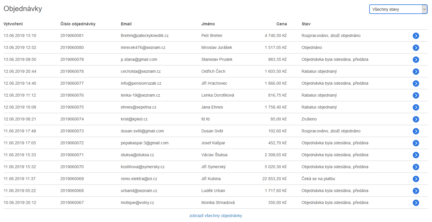 Seznam posledních vytvořených objednávek s možností filtrování stavů a prokliknutí se do detailu objednávky.