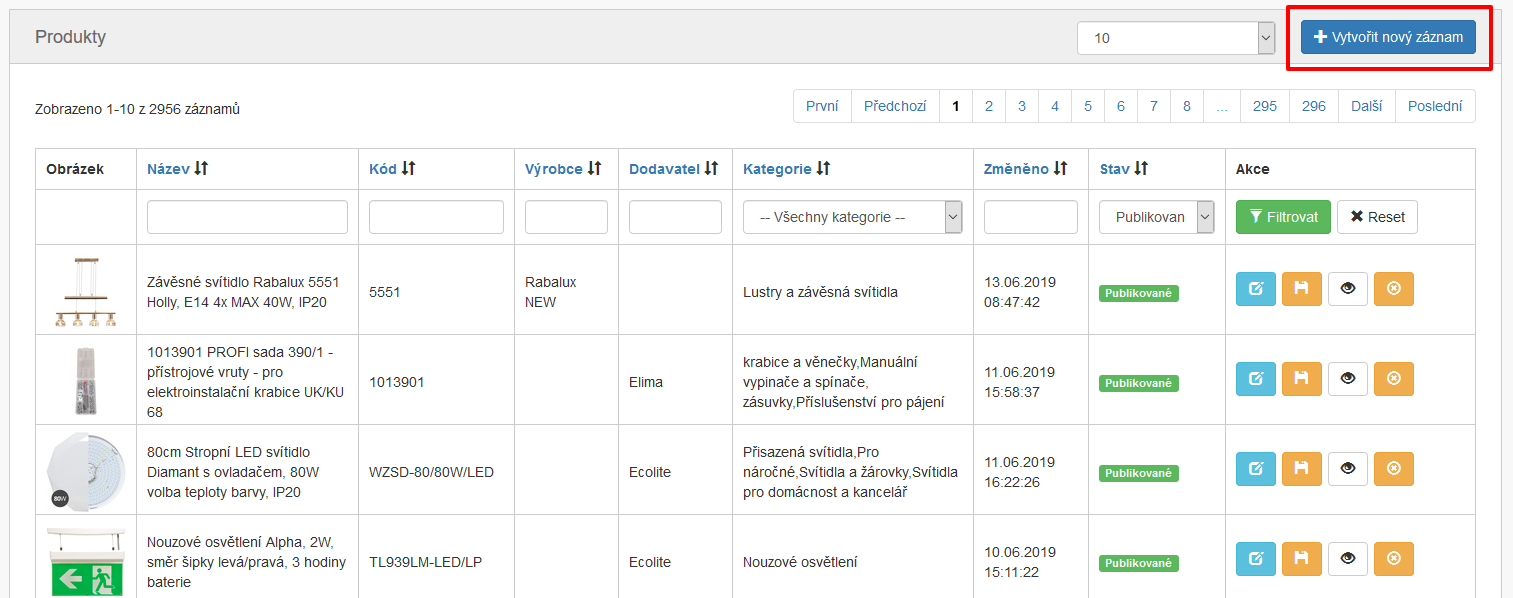 V seznamu produktů klikneme na tlačítko "Vytvořit nový záznam".