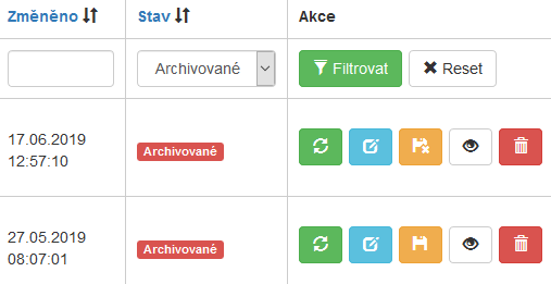 Vyfiltrujeme položky, které jsou uloženy v archivu. Ve sloupci "Stav" vybereme z roletkového seznamu "Archivované" a potvrdíme tlačítkem "Filtrovat". Zobrazí se nám seznam všech archivovaných položek.