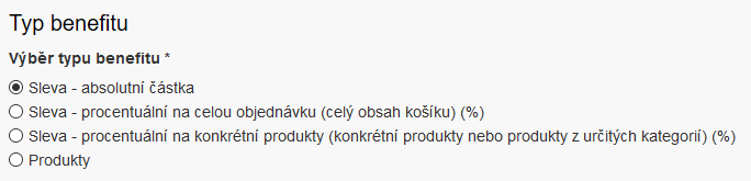 Máme 4 typy benefitů. Po kliknutí na každou položku se zobrazí jiné formulářové prvky.