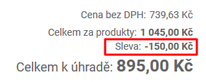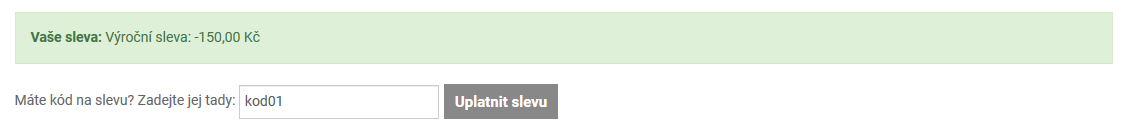 Př.: Výše slevy máme nastavenou na 150 Kč. Podmínky / omezení - Celková hodnota košíku je větší než 1000 Kč. Název slevy - Výroční sleva. Pokud uživatel zadá kód a podmínky jsou splněny, bude výsledek vypadat na FE takto: