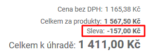 Pokud uživatel splní podmínky, které jsou nastavené v "Podmínky / omezení", tak se mu sníží celková cena v košíku o částku, kterou si nastavíme ve "Výše slevy".