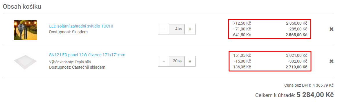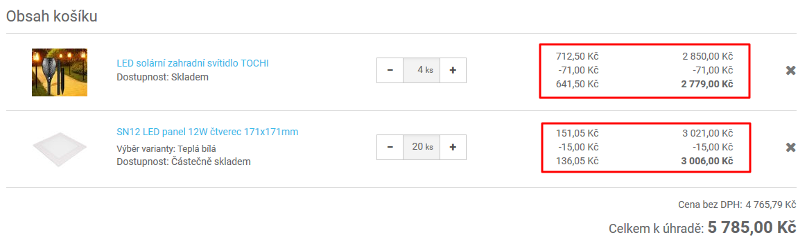 Všiměte si, že sleva je aplikovaná pouze na jeden ks, protože v nastavení slevy jsme definovali, že kód nelze vložit opakovaně: