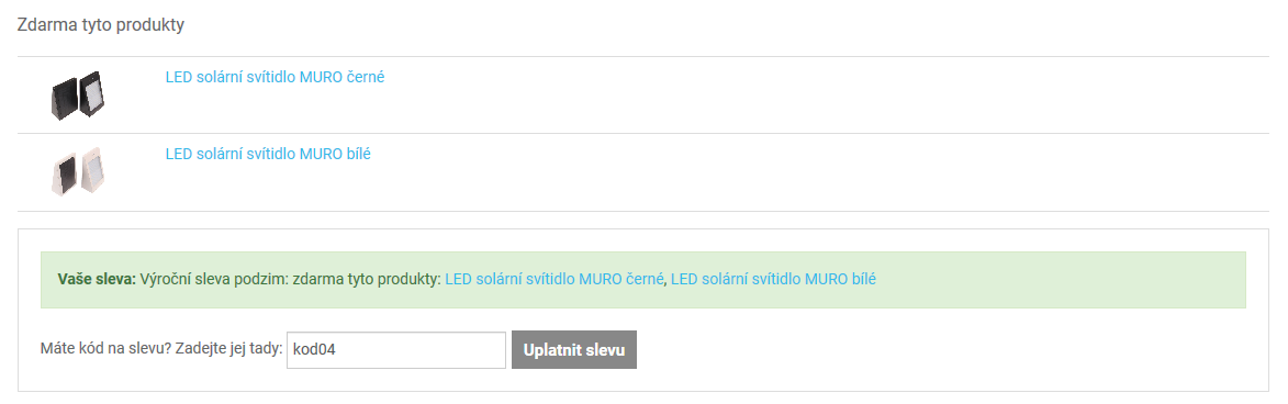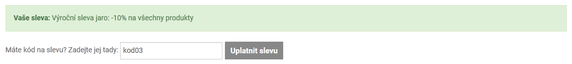 Některé eshopu nabízejí uživatelům slevy v podobě zadání kódu a tím snížení výsledné ceny. Náš systém umožňuje nastavit spoustu kombinací a tím dosáhnout požadovaného výsledku.