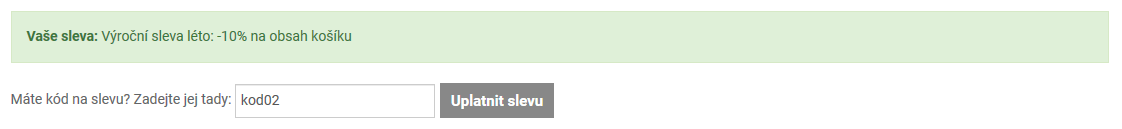 Př.: Výše slevy máme nastavenou na 10%. Podmínky / omezení - Celková hodnota košíku je větší než 1500 Kč. Název slevy - Výroční sleva léto. Pokud uživatel zadá kód a podmínky jsou splněny, bude výsledek vypadat na FE takto: