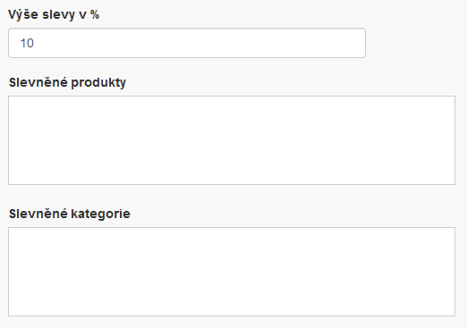 Nastavujeme výši slevy v procentech na konkrétní produkty nebo výběrem kategorie zahrneme produkty, které do ní náleží. Pokud nevybereme žádný slevněný produkt nebo kategorii, tak se automaticky aplikuje sleva na všechny produkty.