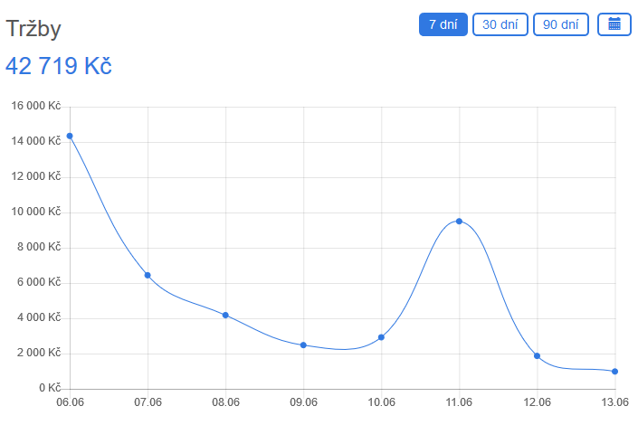 Blok tržby zobrazuje vyřízené a předané objednávky v přehledném grafu. Osa X znázorňuje dny a osa Y součet všech objednávek za daný den.