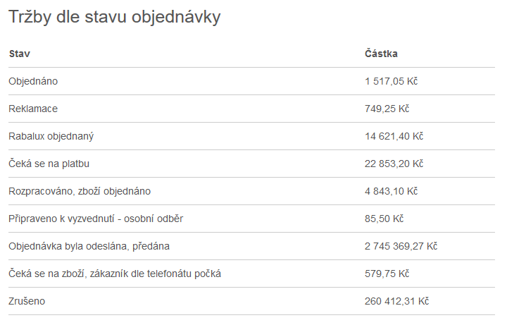 Tento blok zobrazuje všechny definované stavy objednávek a jejich sečtené tržby.