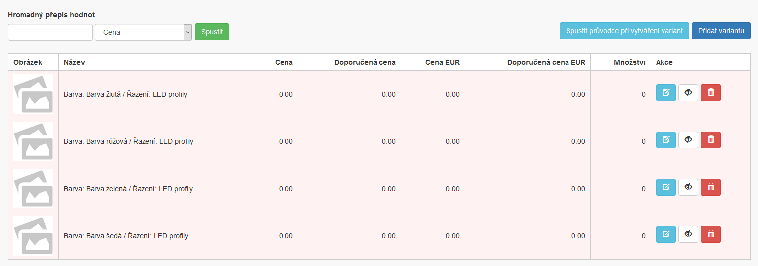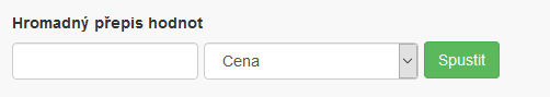 Pro hromadný přepis stačí zadat hodnotu a zvolit sloupec, který chceme přepsat. Klikneme na tlačítko "Spustit" a systém automaticky přepíše nastavené hodnoty pro všechny vytvořené varianty u produktu.