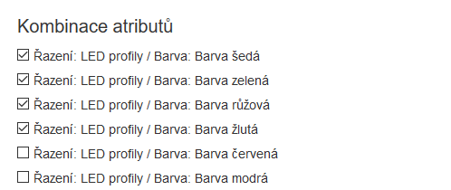 Vybereme parametry, které chceme zařadit do variant. Pokračujeme kliknutím na tlačítko "pokračovat na kombinaci atributů". Zobrazí se nám další dialogové okno s kombinacemi atributů.