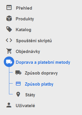Pro zobrazení způsobu dopravy klikneme na položku "Doprava a platební metody -> Způsob platby" v levém menu.