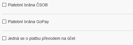 Při výběru této volby, uživatel dostane v obsahu emailu informaci o zaplacení částky převodem na účet. Email obsahuje číslo účtu, kód banky atd. a navíc vygenerovaný QR kód.